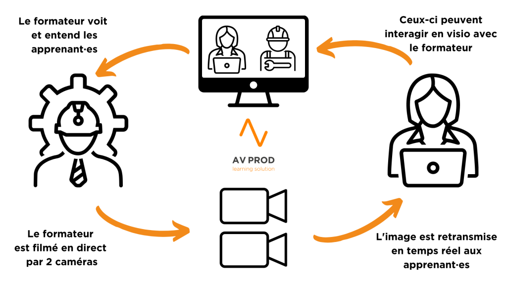 Dans ce cas précis, le dispositif a été mis en place la veille de la formation. L'installation a duré trois heures, dans les locaux de Leroy Merlin Tourcoing - Neuville-en-Ferrain. Une mini-régie a été installée, ainsi que deux caméras et une régie de streaming. L’outil Google Meet a été intégré, couplé à un système d’écran et d’enceintes retour. L’ensemble permet de communiquer en temps réel avec les apprenant·es.